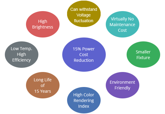 - LEDs lighting has a life of 50,000 hours and can go upto 100,000 burning hours.